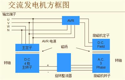 柴油机驱动德令哈发电机转动时,主转子上的剩磁在主定子产生一个小交流电压,此电压被AVR整流为直流并加在励磁定子上;励磁定子产生了一个磁场,磁场又使励磁转子感应出交流电压,通过旋转整流器转变为直流,提供给主转子;此时转子产生一个更大的磁场,其交流电压也更高;通过上述过程的不断循环,当德令哈发电机的输出电压趋近额定电压时,AVR开始限制通向励磁定子的电压,从而使德令哈发电机输出保持恒定。
